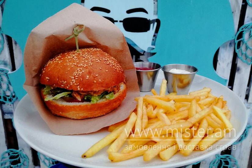 Булочка пшенична, куряче філе, соус часниковий та фірмовий BBQ, кетчуп, французька гірчиця, огірок солоний, мисливський сир, мікс салату. Подається з картоплею фрі, кетчупом та часниковим соусом.