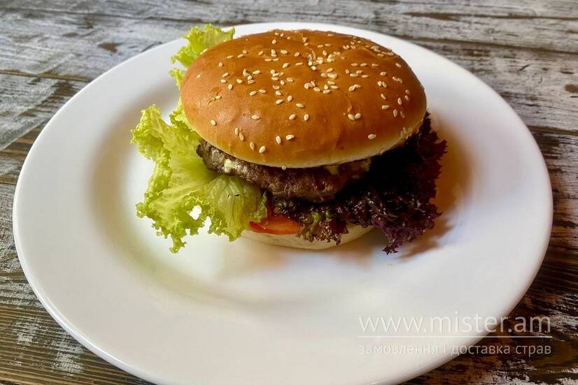 Булочка пшенична, котлета з свинно-яловичого фаршу, бекон, соус часниковий, кетчуп, огірок солоний, сир чеддер, цибуля пай, мікс салатів.