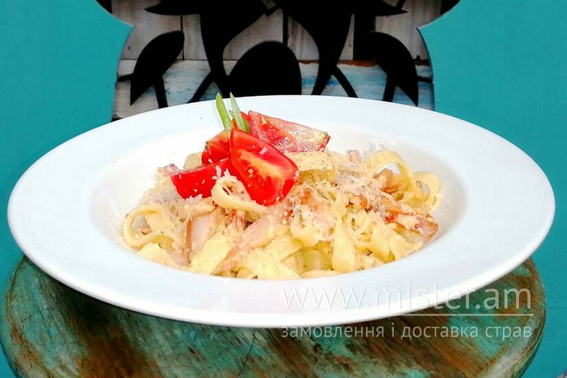 Паста з беконом під ніжним вершковим соусом, з яйцем, пармезаном і томатами.