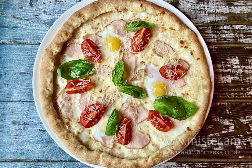 Сир моцарела, сир пармезан, куряче філе копчене, томати чері, вершки, базилік та перепелині яйця.