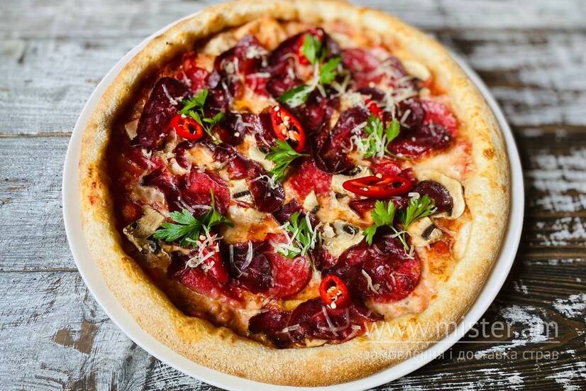 Томатний соус, моцарела, салямі, печериці, бастурма, перець чілі, пармезан, зелень.