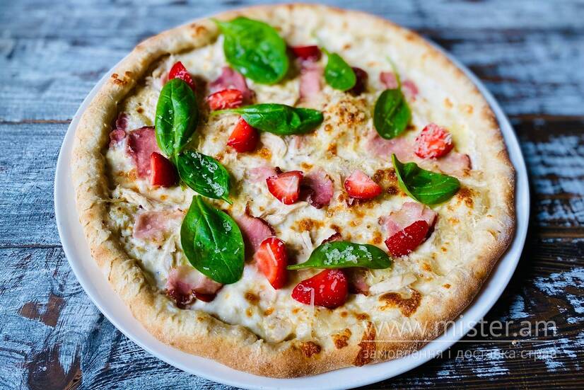 Вершковий соус з французькою гірчицею, моцарела, куряче філе, бекон, полуниця, шпинат, пармезан, соус солодкий чілі.