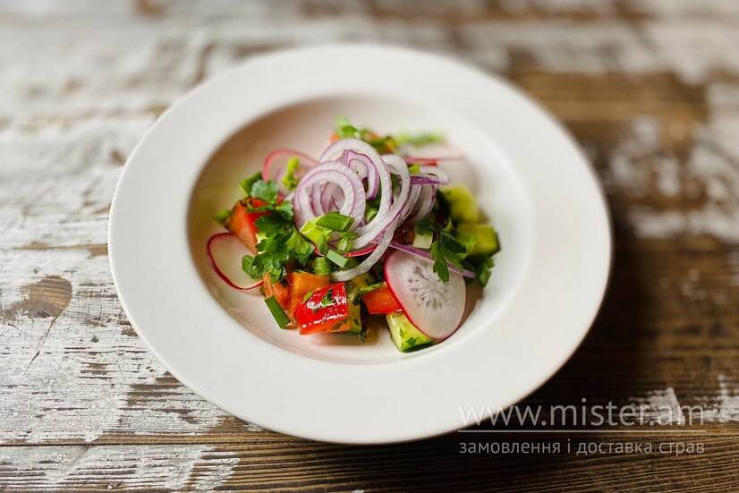 Свіжі огірки, томати, болгарський перець, редис, зелень, червона цибуля, заправлений домашньою олією