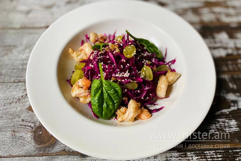 Салат з червонокачанної капусти, з креветкою та виноградом