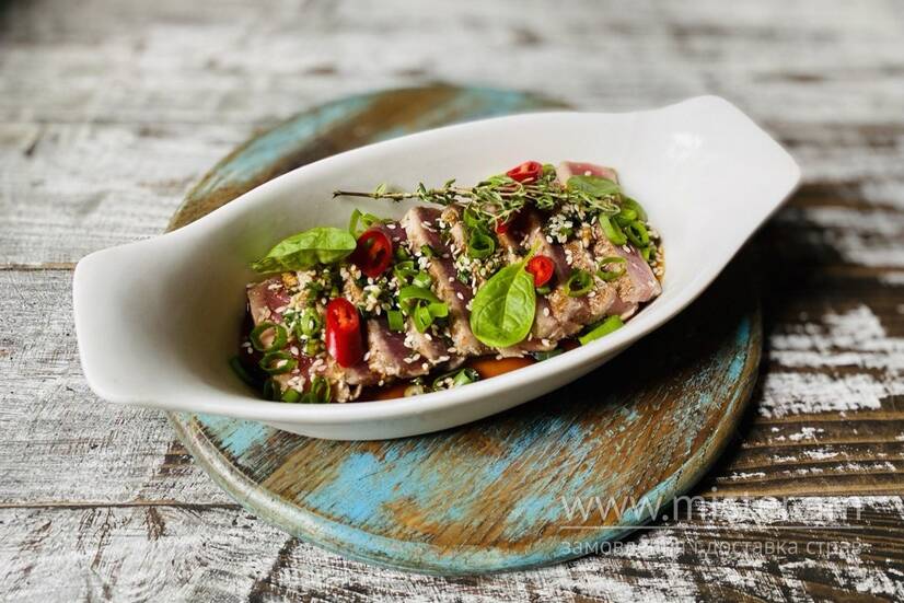 Слайси тунця прожарки rare з соєво-імбирним соусом з кунжутом, зеленою цибулею та перцем чілі.