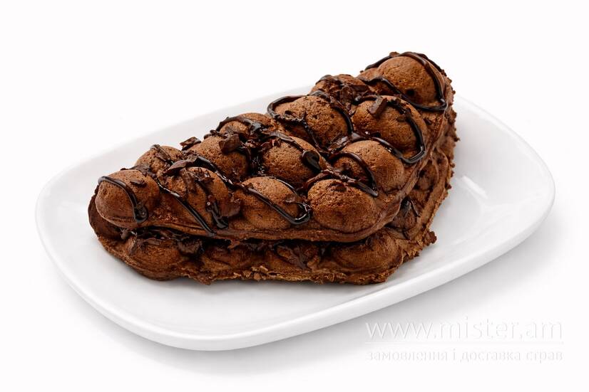 Бананова вафля власного виробництва, начинка шоколадна з додаванням шматочків печива, сублімовані банани, топінг шоколад, банан.