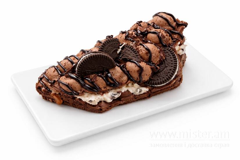 Шоколадна вафля власного виробництва, начинка орео, топінг шоколад, крихти вафельні, крихти чорного шоколаду.