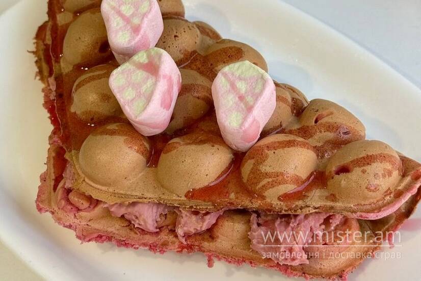 Полунична вафля власного виробництва, полунична начинка з роялтіном, топінг полуниця, маршмелоу.