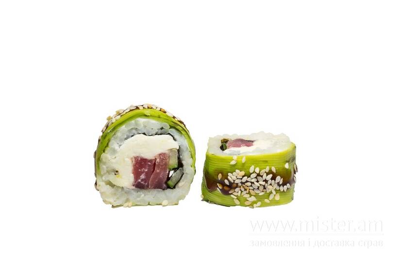 Рис, норі, крем-сир, огірок, крем-сир, тунець, авокадо.
