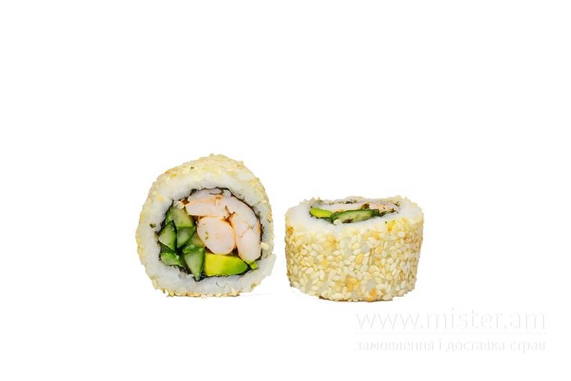 Рис, норі, крем-сир, креветка, огірок, авокадо, японський майонез, кунжут білий.