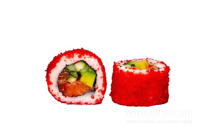Рис, норі, крем-сир, ікра "Масаго" червона, лосось, огірок, авокадо, японський майонез.