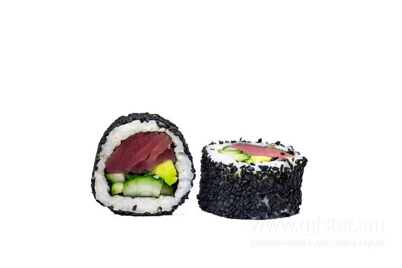 Рис, норі, крем-сир, тунець, огірок, авокадо, японський майонез, кунжут чорний.