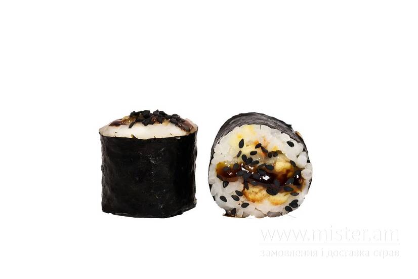 Рис, норі, вугор, соус унагі, кунжут чорний.