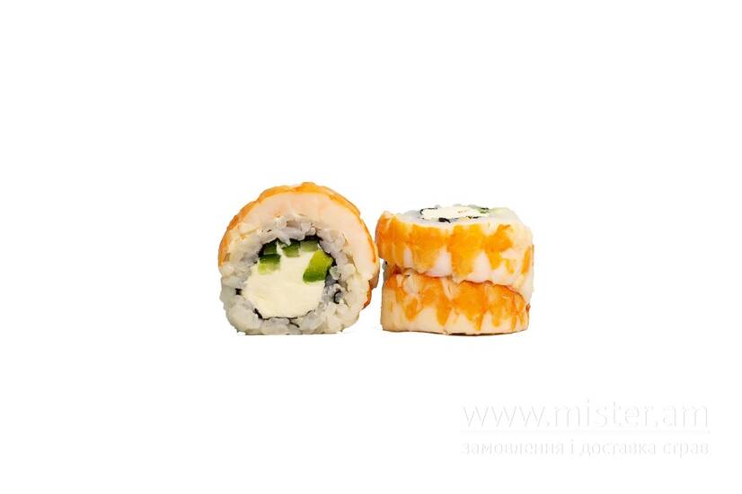 Рис, норі, крем-сир, огірок, авокадо, креветка.
