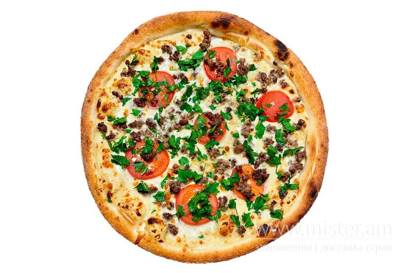Вершково-гірчичний соус, сир моцарела, копчений фарш, томати, петрушка.