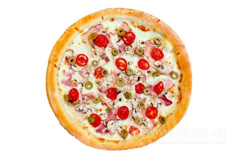 Вершковий соус, сир моцарела, бекон, шинка, печериці, томат чері, оливки.