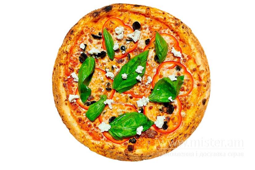 Соус пілаті, сир моцарела, болгарський перець, маслини, сир фета, базилік.