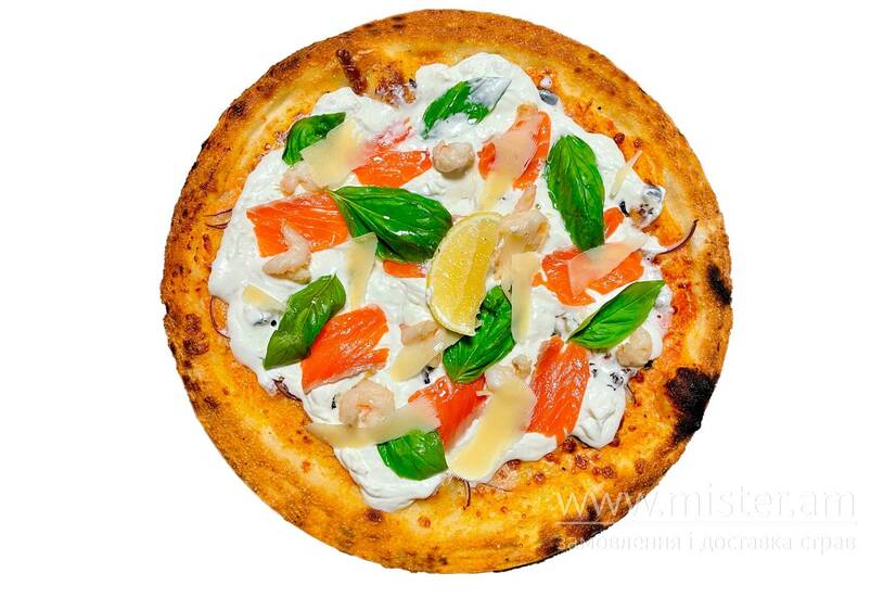 Вершково-червоний соус, сир моцарела, червона цибуля, креветки, крем пармезан, базилік, форель, оливки, лимон.