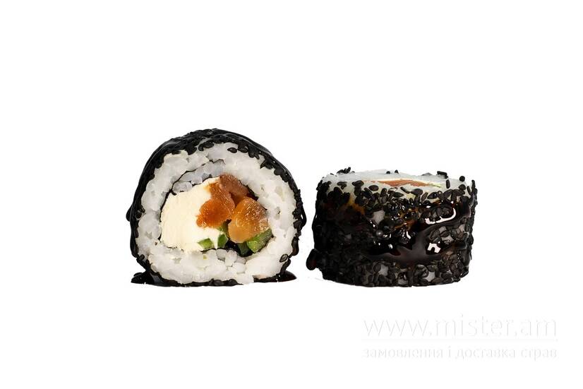 Рис, норі, крем- сир, лосось маринований, огірок, кунжут чорний, соус унагі.