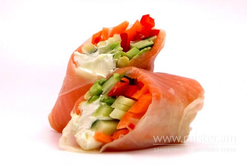 Склад: лосось, крем-сир, авокадо, перець червоний, огірок, морква, рисовий папір.