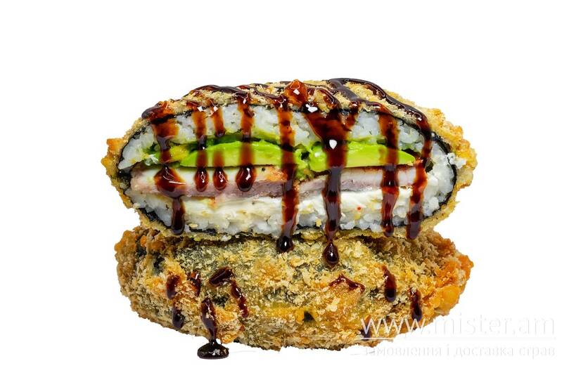 Склад: норі, рис, крем-сир, вугор, авокадо, темпура, сухарі панко, соус унагі.