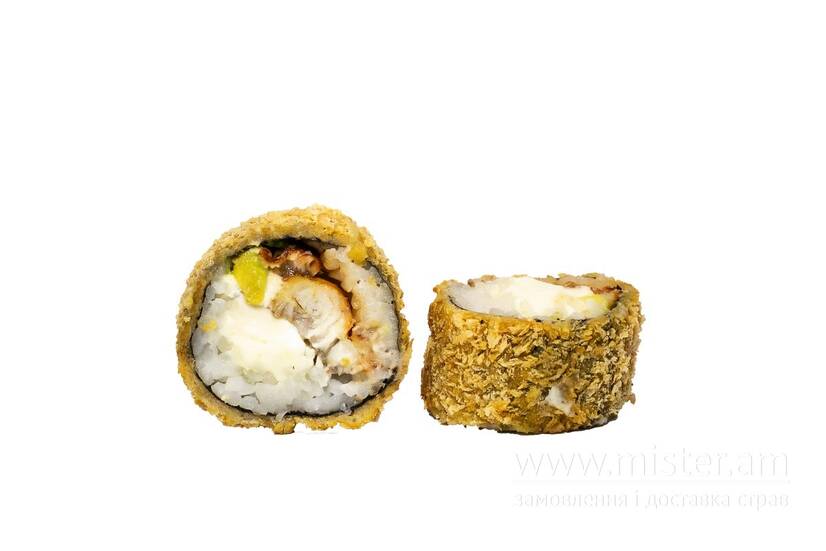 Рис, норі, крем-сир, авокадо, вугор, темпура, сухарі панко.