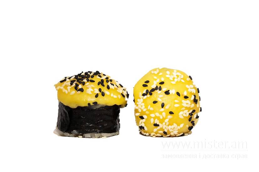 Рис, норі, авокадо, крем-сир, тунець, кунжут білий, кунжут чорний, сир гауда, японський майонез.