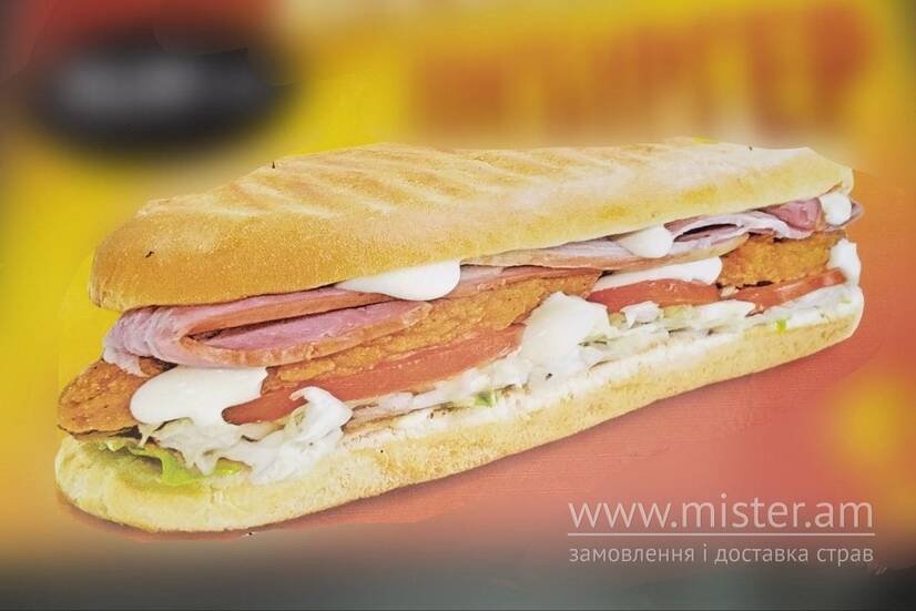 Булочка лонг, соус гірчичний щедро, бекон копчений, смажена цибуля, помідори свіжі, філе куряче в паніровці, салат айсберг, капуста пекінська.