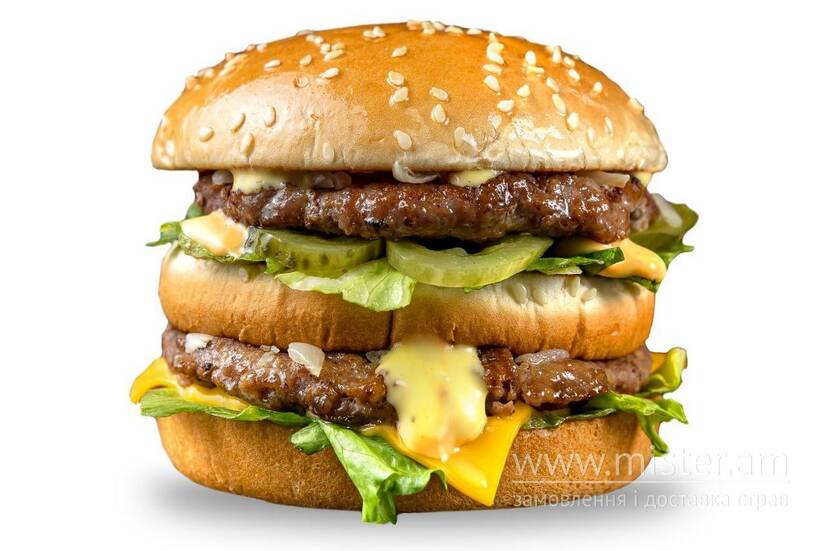 Булочка ДабРаунд, дві яловичі котлети, сир тостовий, огірок маринований, цибуля, фірмовий соус, салат Айсберг.