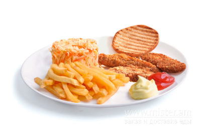Стріпси курячі (3 шт.), булочка (половинка), картопля фрі мала, салат Коул Слоу, соус BBQ, соус Гірчичний.