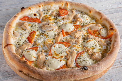 Вершкова основа, сир Моцарела, куряче філе, помідори, сир Маскарпоне, орегано.