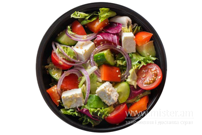 Сир Фета, помідори, перець болгарський, огірки свіжі, капуста, маслини, цибуля, кунжут, заправка для салату Грецький.