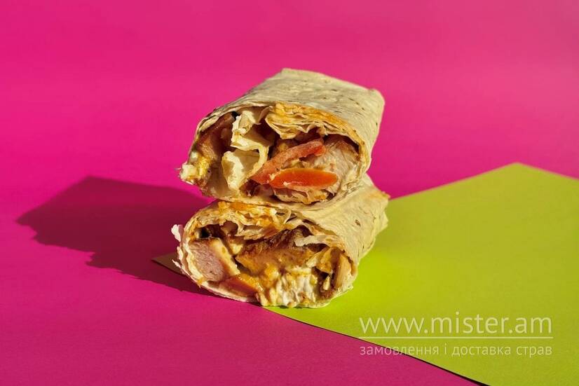 Куряче філе, соус часниковий, крем-сир, помідор, бекон, лаваш.