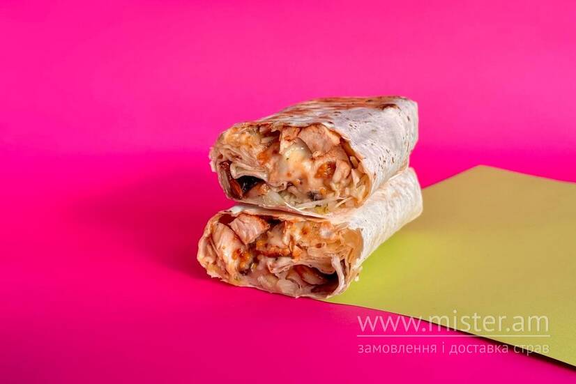 Куряче філе, капуста, обсмажені печериці, сир сулугуні, трюфельний соус, гірчиця французька, соус часниковий, лаваш.