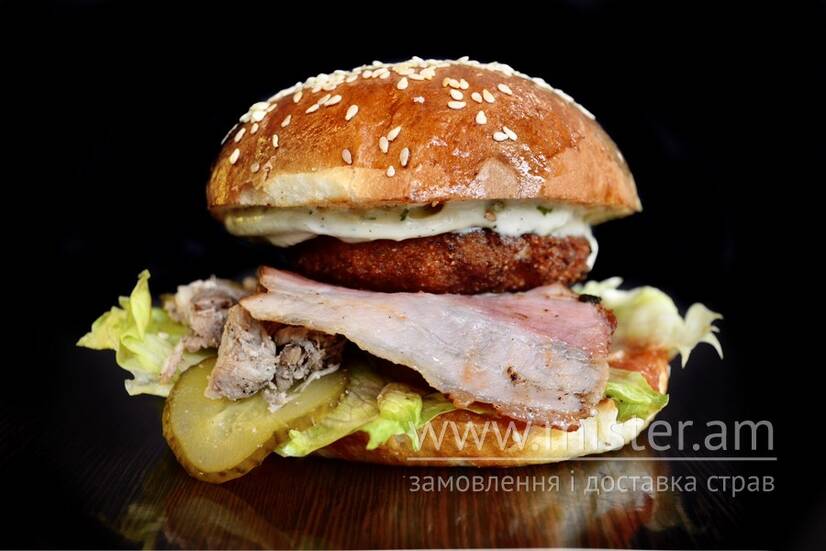 Булочка бріош, яловича котлета, куряча котлета в паніровці, бекон, рвана свинина, білий соус часниковий, сир гауда, соус барбекю.