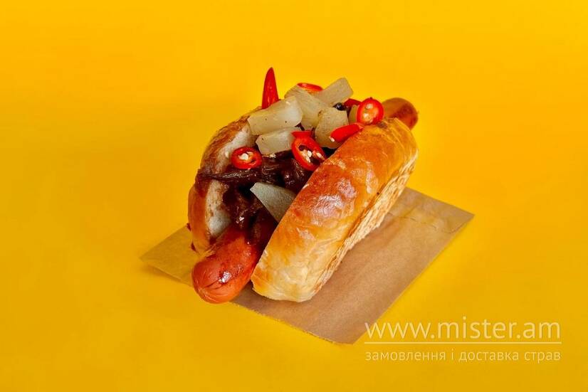 Молочна сосиска, рвана яловичина, ананас, беконовий джем, соус барбекю, булочка.