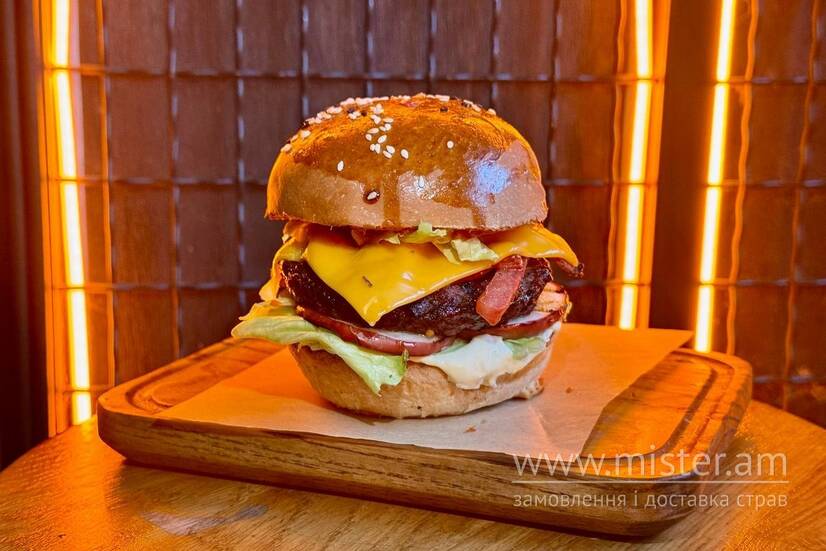 Булочка бріош, яловича котлета, лист салату айсберг, солоний огірок, сир чеддер, кетчуп, білий соус на основі майонезу.