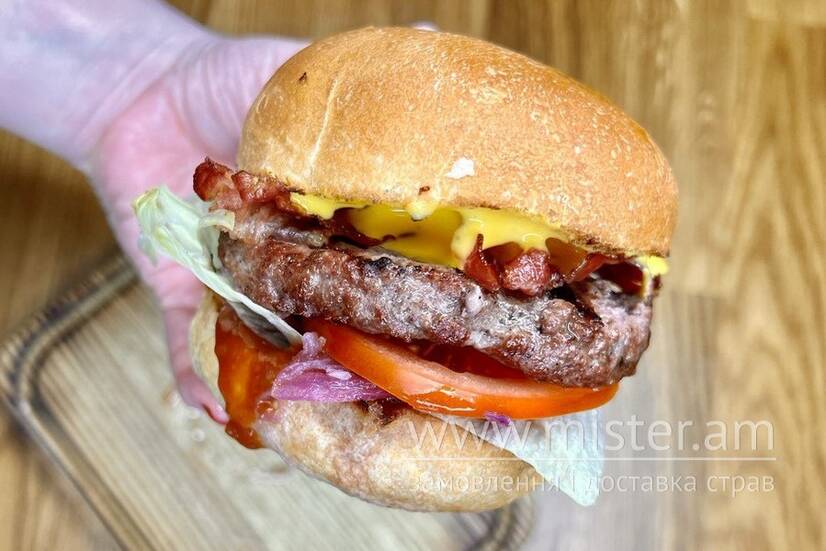 Булочка бріош, яловича котлета, салат айсберг, помідор, свіжий огірок, бекон, маринована цибуля, соус BBQ, соус сирний. Подається з картоплею по-селянськи та кетчупом.