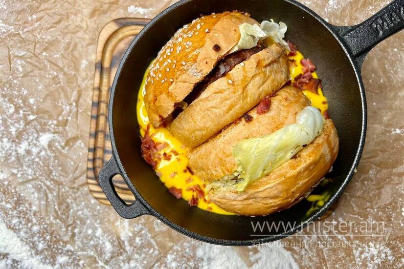 Булочка бріош, котлета з яловичини, бекон, солоний огірок, салат айсберг, соус цацикі, соус барбекю-яблучний. Подається з картоплею по-селянськи та сирним соусом.