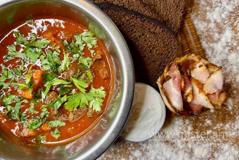 Підчеревина, яловичина, картопля, морква, болгарський перець, цибуля, перець чилі, томатна основа, бульйон. Подача: сметана. хліб бородинський з салом.