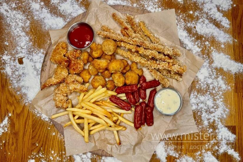 Косичка фрі, печериці фрі, тигрові креветки фрі, ковбаски пивчики, картопля фрі, соус спешиал, соус кетчуп.