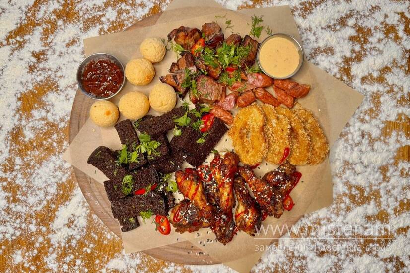 Шашлик зі свинини, крильця баффало, ковбаски пивчики, кальмар фрі, сирні кульки, сухарі бородинські, соус special, соус барбекю сливовий.