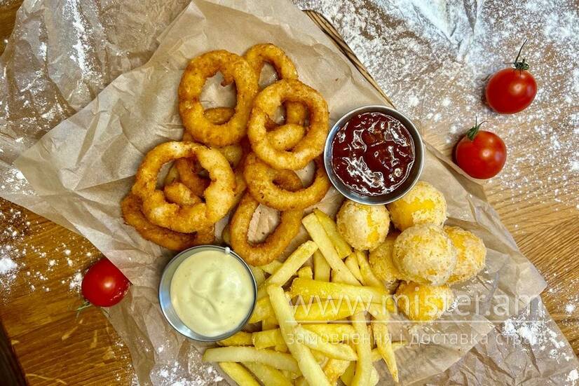 Сирні кульки, цибулеві кільця, картопля фрі, соус часничний, соцс барбекю.