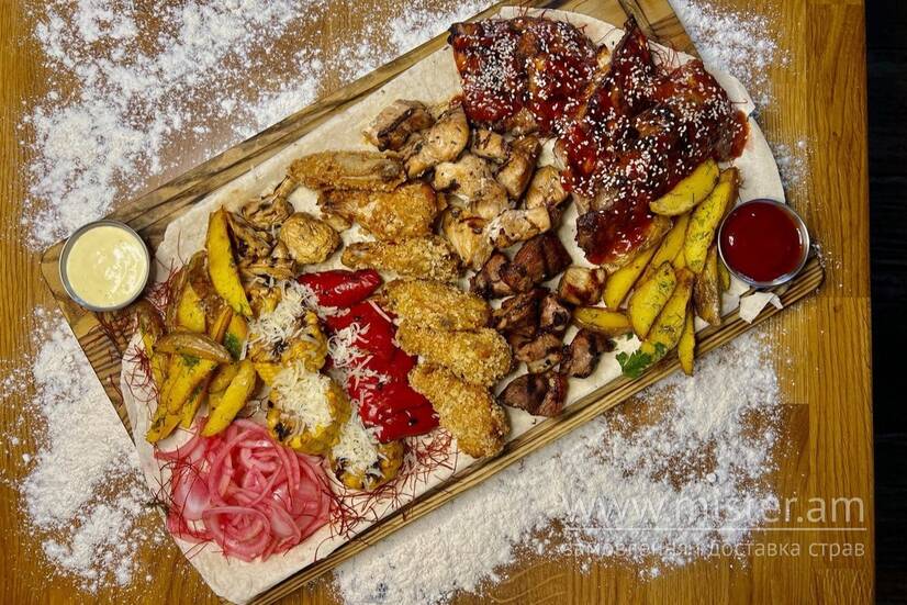 Шашлик зі свинини, шашлик з курки, свинні ребра на грилі, крильця лимонно-медові, кукурудза на грилі, болгарський перець на грилі, печериці на грилі, картопля по-селянськи, маринована цибуля, соус ткемалі, соус часниковий.