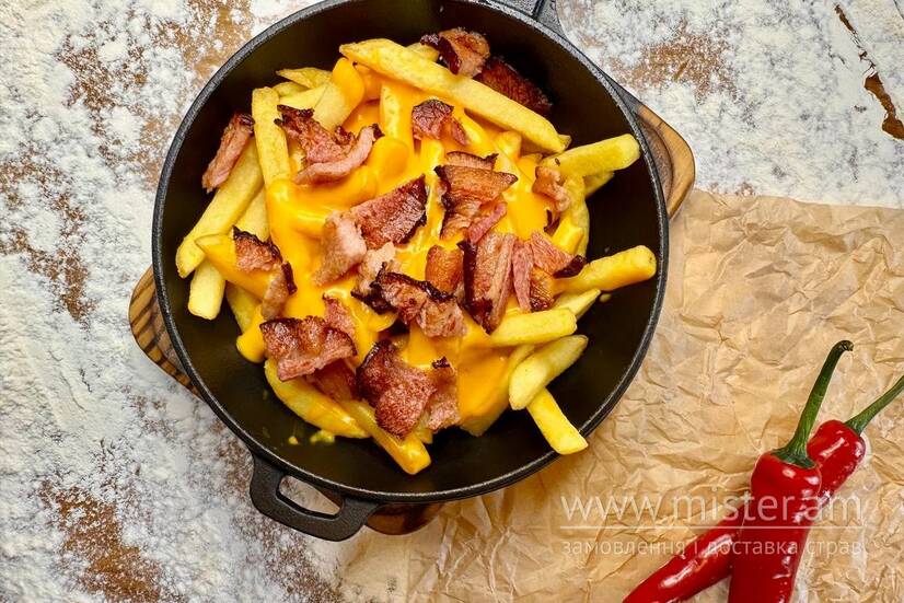 Картопля фрі, сирний соус, чіпси з бекону.