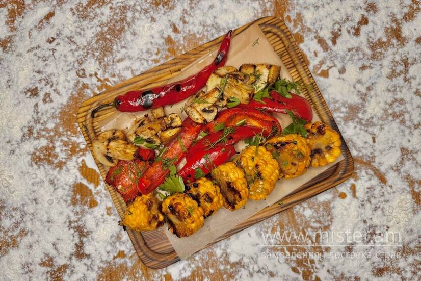 Печериці на грилі, болгарський перець, цукіні, кукурудза, перець чилі.