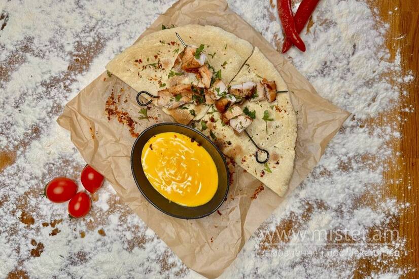 Курячий шашлик, сирний соус, крутони (грінки).