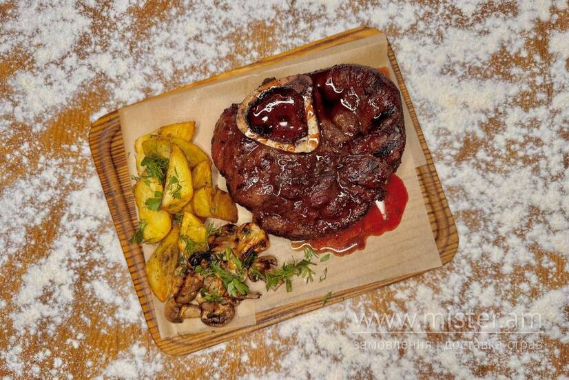 Стейк яловичий особуко, картопля по-селянськи, печериці на грилі, соус наршараб.