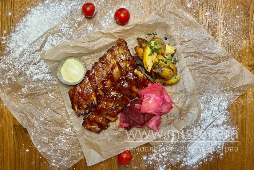 Ребра у соусі BBQ, картопля по-селянськи, пелюски з маринованої капусти, соус часничний.