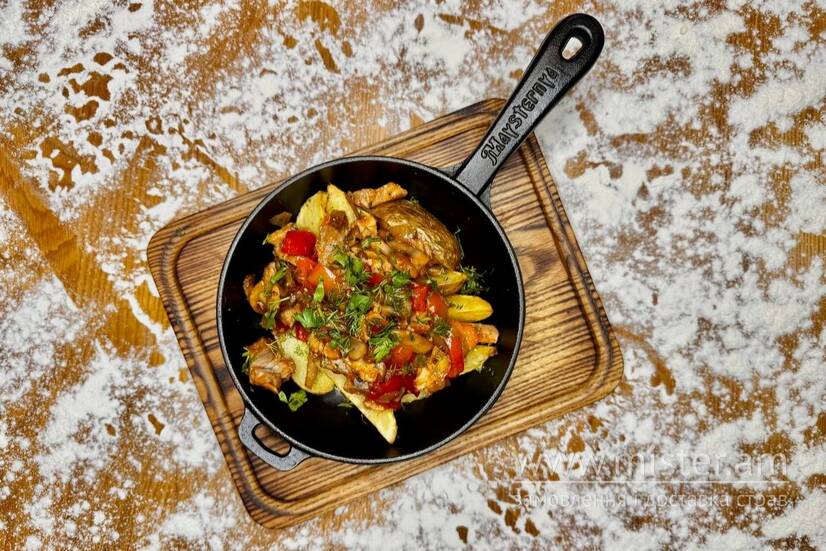 Картопля по-селянськи, рвана свинина обсмажена в соусі барбекю сливовий, з печерицями, болгарським перцем та цибулею.